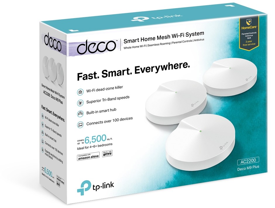 POWER AC adapter input 100-240V ~ 50/60Hz 0.8A AC adapter output 12V ⎓ 2A HARDWARE FEATURES Ports 2 * LAN/WAN Gigabit Ethernet Ports 1 * USB 2.0 Port (reserved) 1 * Power Port Button 1 Reset button on the underside External Power Supply 12 V/2 A Dimensions Φ5.7 in. x 1.8 in. (Φ144 mm × 46 mm) Antenna Type 8 internal antennas per Deco unit WIRELESS FEATURES Wireless Standards IEEE 802.11 ac/a 5 GHz IEEE 802.11 b/g 2.4 GHz Bluetooth 4.2 ZigBee HA1.2 Frequency 2.4 GHz and 5 GHz Signal Rate 867 Mbps at 5 GHz (1) 867 Mbps at 5 GHz (2) 400 Mbps at 2.4 GHz Transmit Power FCC: <30 dBm CE: <20 dBm (2.4 GHz) <23 dBm (5 GHz) Wireless Security WPA-PSK/WPA2-PSK Advanced Functions ● Router/ Access Point Mode ● Optional Ethernet Backhaul ● TP-Link Mesh Technology: MU-MIMO Auto Path Selection Self-Healing AP Steering Band Steering Beamforming SOFTWARE FEATURES Quality of Service WMM WAN Type Dynamic IP/Static IP/PPPoE Management Local Management Remote Management DHCP Server Client Firewall Security SPI Firewall Protocols Supports IPv4 and IPv6 Advanced Features Parental Controls 3-Year Free Built-In Antivirus QoS (Quality of Service) Reporting Assisted Setup Works with Alexa & IFTTT Automation (for smart home devices) Guest Network 2.4 GHz guest network * 1 5 GHz guest network * 1 OTHERS Package Contents ●Deco M9 Plus (3-pack): 3 Deco units 1 RJ45 Ethernet Cable 3 Power Adapters ●Deco M9 Plus (2-pack): 2 Deco units 1 RJ45 Ethernet Cable 2 Power Adapters ●Deco M9 Plus (1-pack): 1 Deco unit 1 RJ45 Ethernet Cable 1 Power Adapter Smartphone/Tablet Requirements iOS 8.0 or later Android 4.3 or later Bluetooth 4.2 or later Environment Operating Temperature: 0℃~40℃ (32℉~104℉) Storage Temperature: -40℃~70℃ (-40℉~158℉) Operating Humidity: 10%~90% non-condensing Storage Humidity: 5%~90% non-condensing