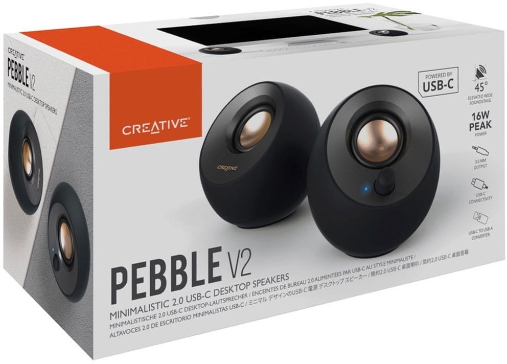 SPECIFICATIONS Brand Creative Series Pebble Plus 2.1 Speaker Configuration 2.0 System Drivers 2″ Full Range Speaker Driver with Passive Radiator System Power Output 2 x 4W RMS Total System Power Output Up to 8W RMS Peak Power 16W Signal-to-Noise Ratio (SNR) 75dB Frequency Response 100Hz - 17000Hz Connector Type 3.5 mm Analogue Stereo Connector USB Type-C Colour Black Operating Temperature 0°C - 45°C Other Features Built-in Gain Switch Dimensions Left / Right Satellite 122mm x 116mm x 115mm Cable Length Line In 1.2m Cable Terminated with 3.5mm Stereo Jack DC Power 1.2m Cable Terminated with USB Type-C Right to Left Speaker 1.35m Molded Cable Weight Left Satellite 0.30Kg Right Satellite 0.34Kg General System Requirements USB Power via Desktop / Laptop USB Ports For the Best Experience Connect to Higher Current USB Power Adapter of up to 5V 2A Output or USB C 10W Power Adapter Analog Audio Devices with a 3.5mm Stereo Output